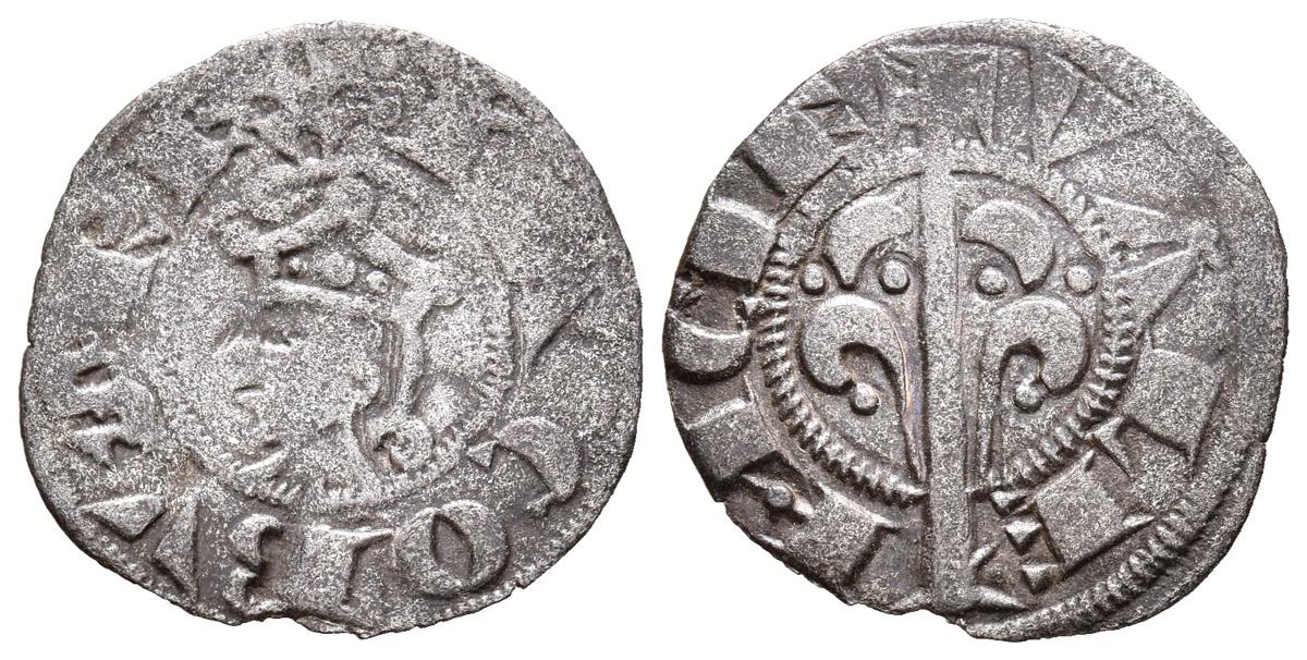 JAIME I (1213-1276). Dinero. (Ve. 0,60g/16mm). Valencia. (Cru.V.S. 316). Anv: Busto coronado de Jaime I a izquierda dentro de gráfila, alrededor leyenda: IACOBVS REX. Rev: Arbol con las ramas bajas dentro de gráfila, alrededor leyenda: VALENCIE. MBC-.