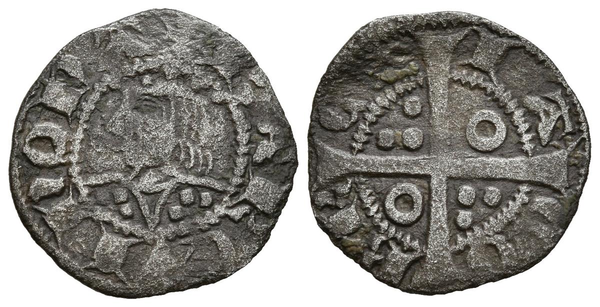 JAIME II (1291-1327). Dinero (Ve. 0,86g/16mm). Barcelona. (Cru.V.S. 340). Anv: Efigie coronada de Jaime II a izquierda, alrededor leyenda: BARQVINONA. Rev: Cruz con tres puntos en 1º y 4º cuadrante, y anillos en 2º y 3º cuadrante, alrededor leyenda: IACOB REX. MBC.