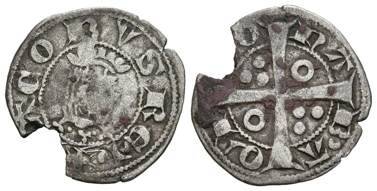 JAIME II (1291-1327). Dinero (Ve. 0,86g/17mm). Barcelona. (Cru.V.S. 344). Anv: Efigie coronada de Jaime II a izquierda, alrededor leyenda: IACOBUS REX. Rev: Cruz con tres puntos en 1º y 4º cuadrante, y anillos en 2º y 3º cuadrante, alrededor leyenda: BAQINONA. MBC. Cospel faltado. Buen ejemplar.