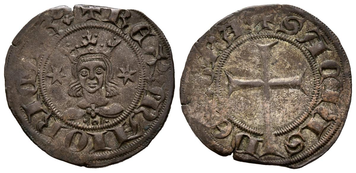 SANCHO I (1311-1324). Dobler (Ve. 1,79g/20mm). Mallorca. (Cru. V.S. 547). Anv: Efigie coronada de frente entre dos estrellas, alrededor leyenda: REX MAIORICAR. Rev: Cruz latina, alrededor leyenda: SACIVS DEI GRA. MBC/MBC-.