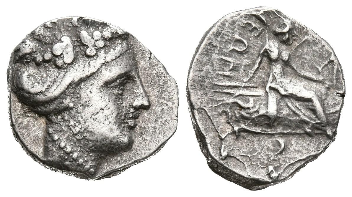 HISTAIA, Euboia. Tetróbolo. (Ar. 1,97g/14mm). Siglo III-Siglo I a.C. (HGC 4, 1524). Anv: Cabeza femenina diademada a derecha. Rev: Histaia sentada sobre proa a derecha, detrás leyenda griega. MBC+.