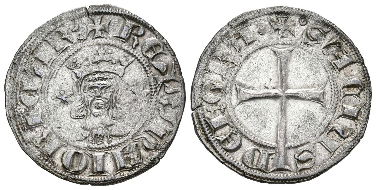 SANCHO I (1311-1324). Dobler (Ve. 1,62g/20mm). S/D. Mallorca. (Cru-547). Anv: efigie de frente coronada entre estrellas. Leyenda: REX MAIORICAR; Rev: cruz latina. Leyenda: SACIUS DEI GRA. MBC+.