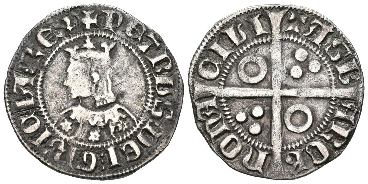 PEDRO III (1336-1387). Croat (Ar. 2,84g/24mm). Barcelona. (Cru V.S. 403.1). Anv: Busto de Pedro III coronado a izquierda con vestido adornado con tres flores de seis pétalos, alrededor leyenda: PETRVS DEI GRACIA REX: Rev: Cruz pasante con anillos y grupos de tres puntos, alrededor leyenda: CIVI TASB ARCH NONA CIVI en anillo. MBC.