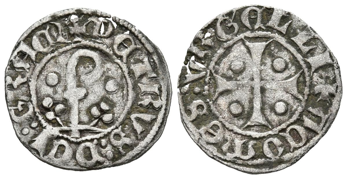 PEDRO DE URGELL (1347-1408). Diner (Ve. 0,65g/17mm). S/D. Agramunt (Condado de Urgell). (Cru-134). Anv: báculo entre puntos y tréboles. Leyenda: PETRVS DEI GRACI. Rev: cruz interior patada con puntos en los espacios. Leyenda: COMES VRGELLI. MBC.