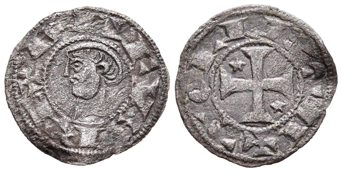 ALFONSO I DE ARAGÓN (1109-1126). Dinero. (Ve. 0,90g/18mm). Toledo. (FAB-23 de Alfonso I de Aragón). Anv: cabeza a izquierda y leyenda: ANFVS REX; Rev: cruz patada con estrellas en primer y tercer cuadrante y en leyenda TOLLETA. MBC.