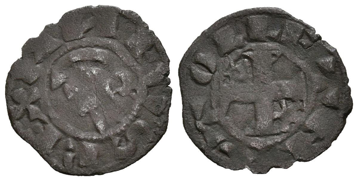 ALFONSO I DE ARAGÓN (1109-1126). Dinero. (Ve. 0,52g/16mm). Toledo. (FAB-23.4; Imperatrix A8:38.3). Anv: Busto de Alfonso VIII a izquierda, alrededor leyenda: ANFVS REX. Rev: Cruz patada con estrellas en 1º y 4º cuadrante, alrededor leyenda: TOLLETA. MBC-.