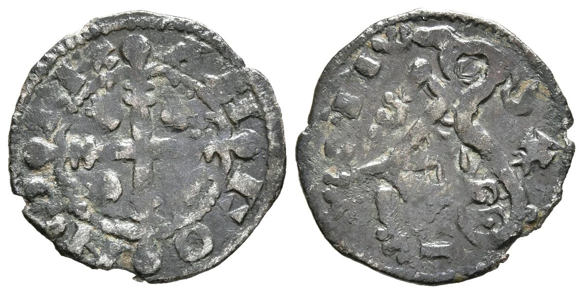 ALFONSO IX (1188-1230). Dinero. (Ve. 0,72g/17mm). ¿Ciudad Rodrigo?. (FAB-129). Anv: Cruz floreada y veneras en los cuarteles, alrededor leyenda: ANFONS REX. Rev: León a derecha encima cruz, debajo leyenda: LEO, delante R retrógada. MBC-. Escaso.
