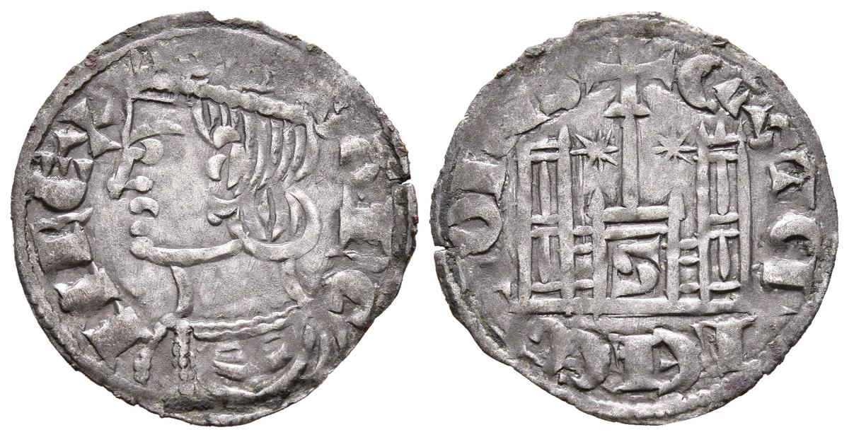 SANCHO IV (1284-1295). Cornado. (Ve. 0,70g/19mm). Sevilla. (FAB-301.2). Anv: busto coronado a izquierda. Leyenda: SACCII REX. Rev: castillo con cruz sobre vástago central, estrellas y marca de ceca en puerta. Leyenda: CASTELLE E LEGIONIS. MBC+