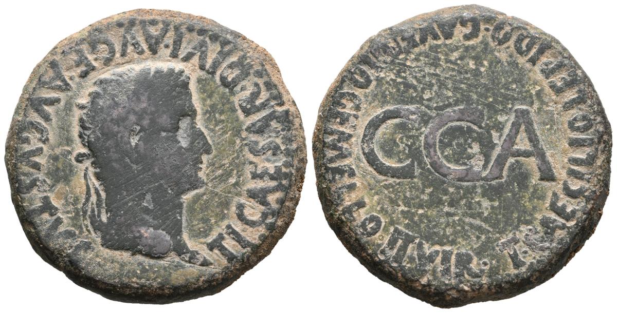 CAESARAUGUSTA (Zaragoza). Dupondio. (Ae. 22,73g/33mm). 14-36 d.C. (FAB-348). Anv: Cabeza laureada de Tiberio a derecha, alrededor leyenda: TI CAESAR DIVI AVG F AVGVSTVS. Rev: CCA, alrededor leyenda: TI CAECILIO LEPIDO C AVFIDIO GEMELLO II VIR. MBC-. Rayitas. Raro. Ex Aureo & Calicó, Subasta 49 (18/10/1994) lote 24.