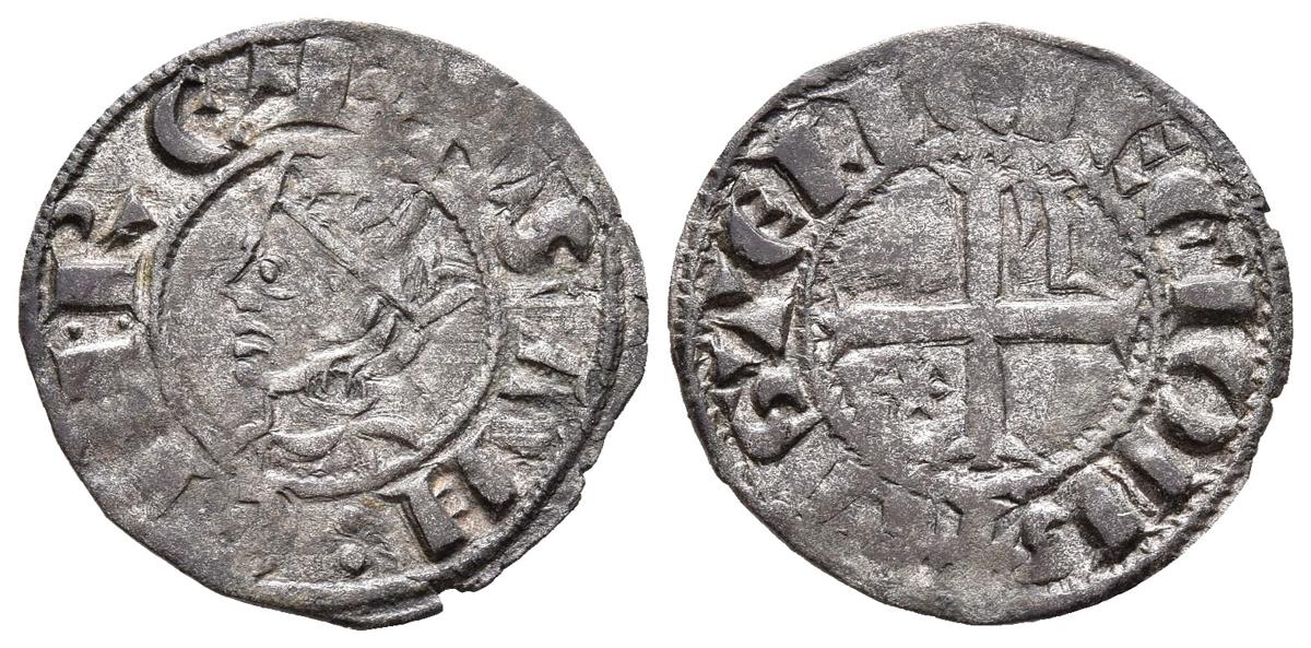 SANCHO IV (1284-1295). Seisén. (Ve. 0,76g/16mm). León (FAB-311.1). Anv: busto coronado a izquierda. Leyenda: SACCII REX. Rev: cruz patada con estrella y L en segundo y cuarto cuadrante. Leyenda: CASTELLE E LEGIONIS. MBC+