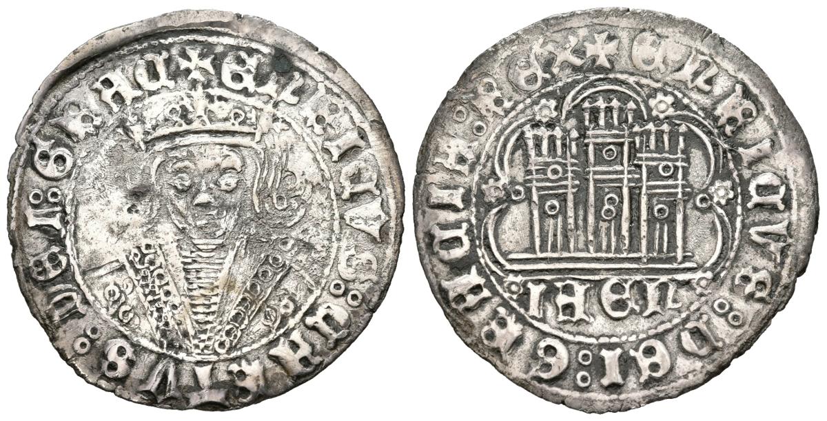 ENRIQUE IV (1399-1413). Cuartillo (Ve. 2,85g/28mm). Jaén. (FAB-746). Anv: Busto coronado de Enrique IV de frente, dentro de gráfila circular, alrededor leyenda: ENRICVS CARTVS DEI GRACIA. Rev: Castillo, debajo IAEN, todo dentro de grafila lobular, alrededor leyenda: ENRICVS DEI GRACIA REX. MBC.
