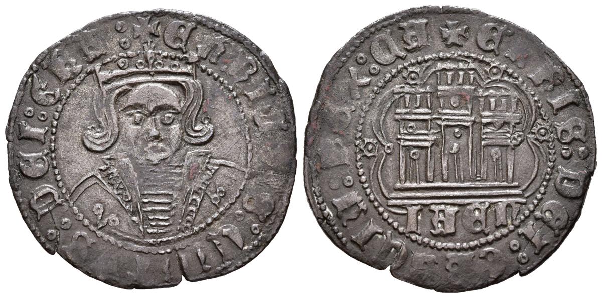 ENRIQUE IV (1399-1413). Cuartillo (Ve. 3,07g/28mm). Jaén. (FAB-746). Anv: Busto coronado de Enrique IV de frente, dentro de gráfila circular, alrededor leyenda: ENRICVS CARTVS DEI GRACIA. Rev: Castillo, debajo IAEN, todo dentro de gráfila lobular, alrededor leyenda: ENRICVS DEI GRACIA REX. MBC+.