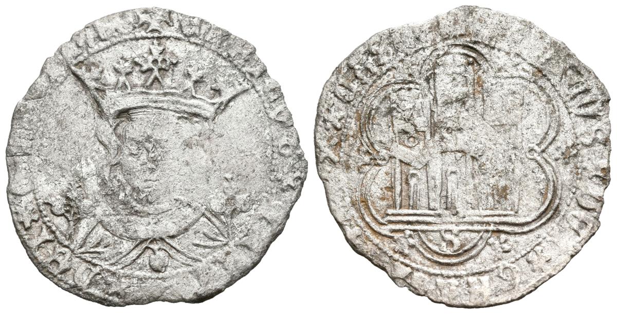 ENRIQUE IV (1454-1474). Cuartillo (Ve. 2,21g/26mm). Sevilla. (FAB-755.8). Anv: Busto coronado del rey de frente con ramas de granado a ambos lados dentro de grafila circular, alrededor leyenda: ENRICVS DEI GRACIA REX Rev: Castillo, debajo S, alrededor leyenda: ENRICVS DEI GRACIA REX CAS. MBC-. Vellón rico.