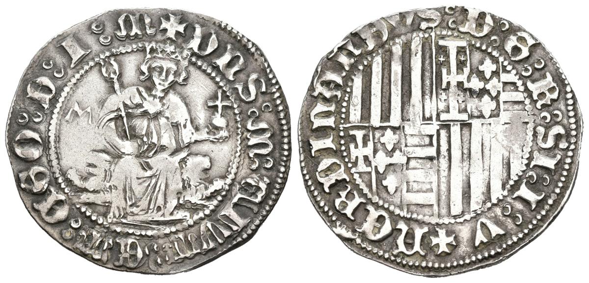 FERNANDO I DE NÁPOLES ( (1458-94). Carlino (Ar. 3,63g/27mm). S/D. Nápoles. (Mir-54/6). Anv: Fernando I sentado de frente, alrededor leyenda: DNS M AIVT EGO DE IN ME. Rev: Barras de Aragón y alrededor leyenda: FERDINANDVS DE G R SI IE VN. MBC+.