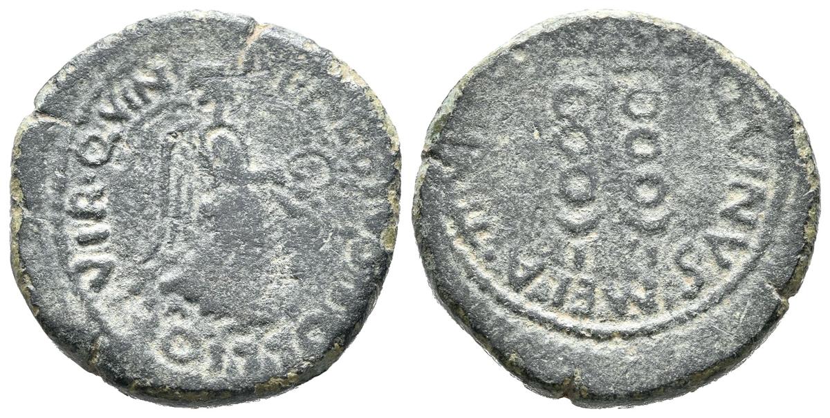 CARTAGONOVA (Cartagena, Murcia). Semis. (Ae. 5,73g/21mm). 27 a.C.-14 d.C. (FAB-580). Anv: Victoria a derecha, alrededor leyenda: P BAEBIVS POLLIO II VIR QVIN. Rev: Dos estandarte, alrededor leyenda: C AQVINVS MELA II VIR QVIN. MBC-.