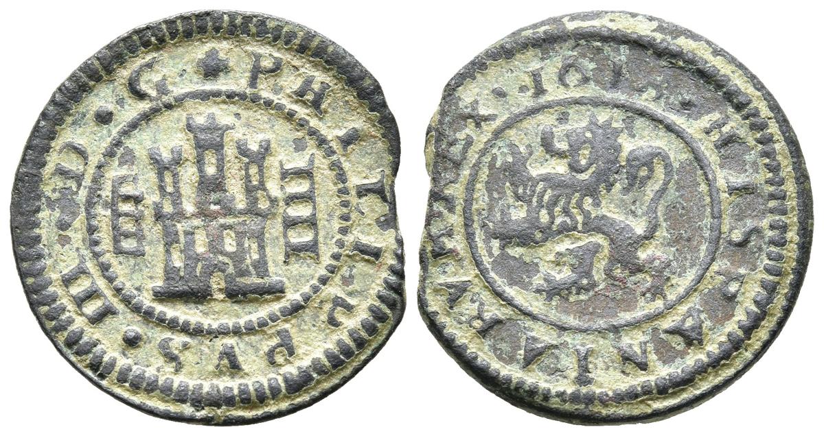 FELIPE III (1598-1621). 4 Maravedís. (Ae. 2,69g/20mm). 1618. Segovia. (Cal-2019-268). MBC+. Final de riel.