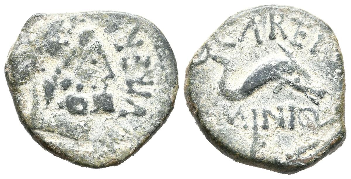 CARTEIA (San Roque, Cádiz). Semis. (Ae. 3,50g/29mm). 27 a.C-14 d.C. (FAB-680). Anv: Cabeza de Neptuno a derecha, detrás tridente, delante leyenda: III VIR ITER. Rev: Delfín a derecha, encima leyenda: CARTEIA, debajo: C MINI Q F. MBC.