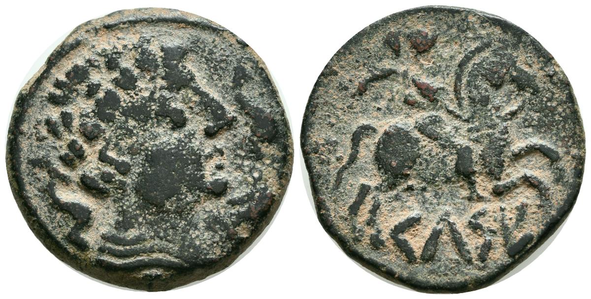 CELSE (Velilla del Ebro, Zaragoza). As. (Ae. 12,29g/27mm). 120-50 a.C. (FAB-771). Anv: Cabeza a derecha con manto y fíbula a derecha, alrededor tres delfines. Rev: Jinete con palma a derecha, debajo leyenda ibérica sobre línea: CeLSE. MBC.