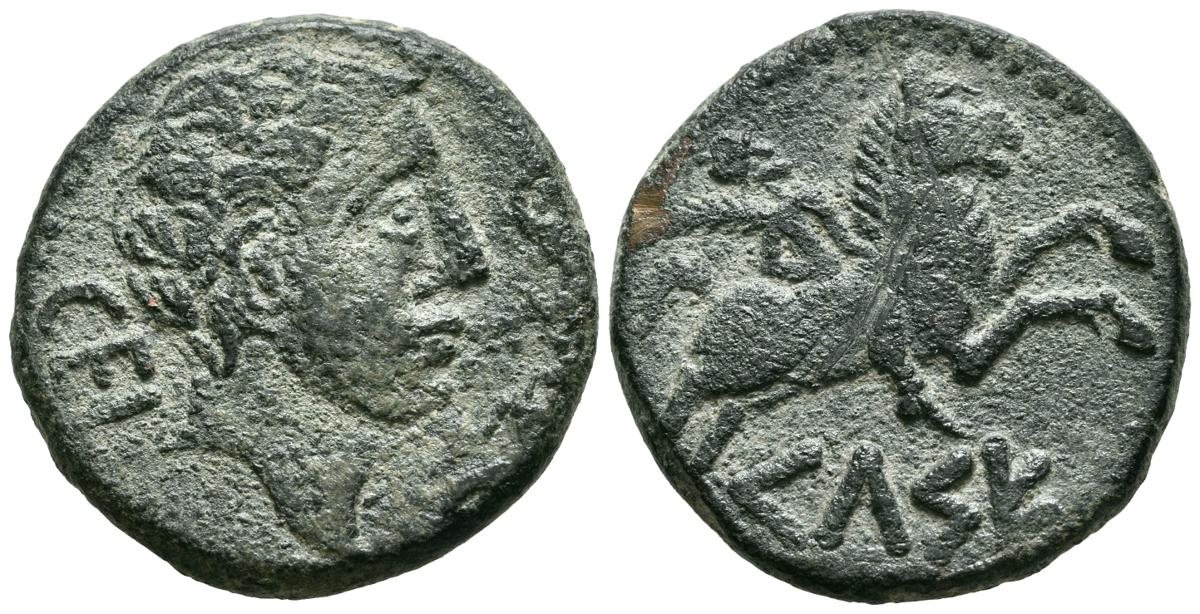 CELSE (Velilla del Ebro, Zaragoza). As. (Ae. 18,97g/31mm). 120-50 a.C. (FAB-773). Anv: Cabeza masculina a derecha, detrás leyenda: CEL, delante dos delfines. Rev: Jinete con palma a derecha, debajo leyenda ibérica: CeLSE. MBC.