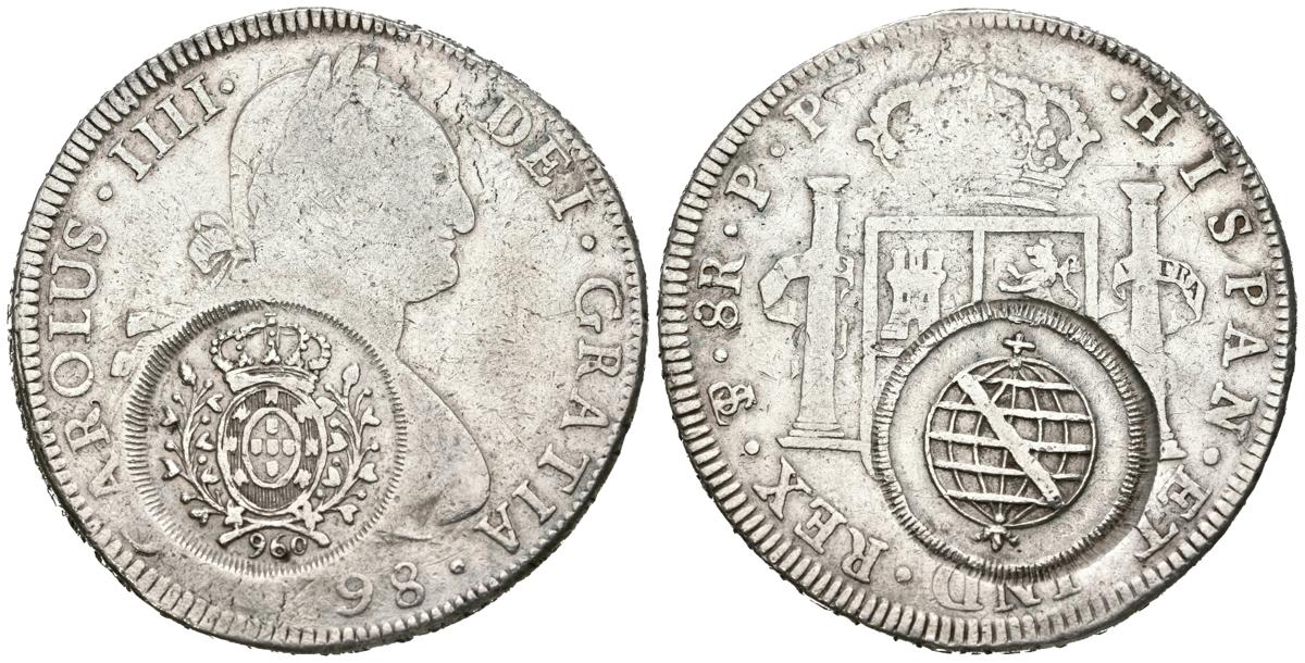 CARLOS IV (1788-1808). 8 Reales (Ar. 26,96g/41mm). 1798. Potosí PP. (Cal-2019-1002). Resellos de Minas Gerais (Brasil) (De Mey 407 y 408) para circular como 960 reis. BC+ Moneda/MBC Resellos. Escasa.