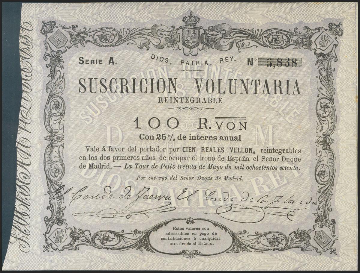 100 Reales de Vellón. 30 de Mayo de 1870. Emisión de Tour de Peilz. Serie A. (Edifil 2021: 196). EBC+.
