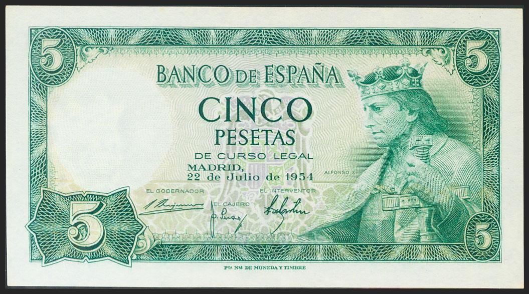 5 Pesetas. 22 de Julio de 1954. Sin serie. (Edifil 2021: 466). Conserva todo el apresto original. SC.