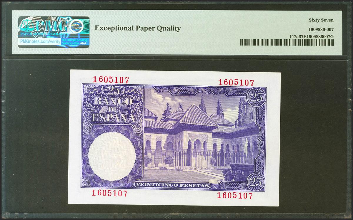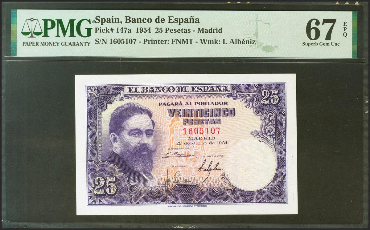 25 Pesetas. 22 de Julio de 1954. Sin serie. (Edifil 2021: 467, Pick: 147a). Raro en esta excepcional calidad, conserva todo su apresto original. SC. Encapsulado PMG67EPQ.