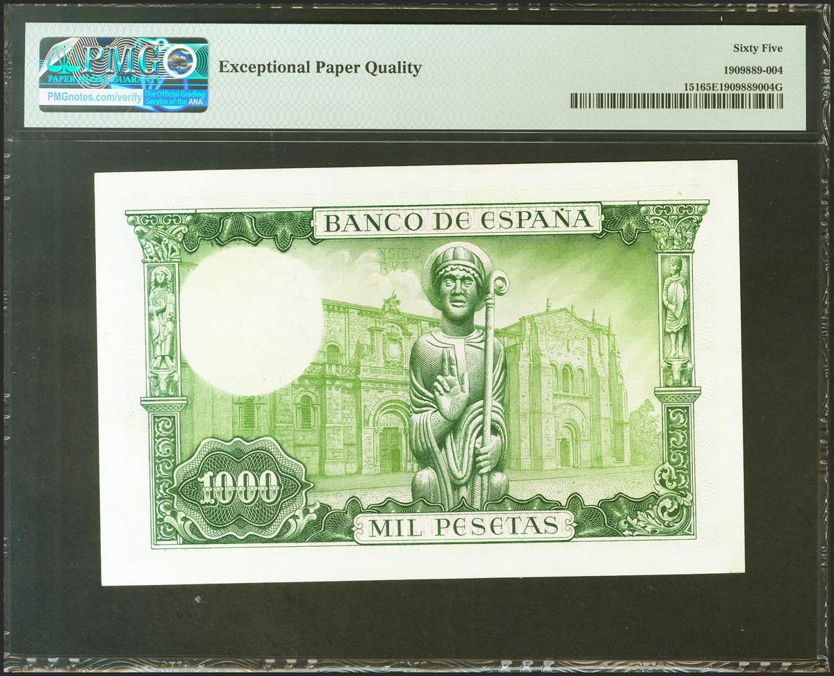 1000 Pesetas. 19 de Noviembre de 1965. Sin serie. (Edifil 2021: 471, Pick: 151). Inusual en esta calidad, conserva todo su apresto original. SC. Encapsulado PMG65EPQ.