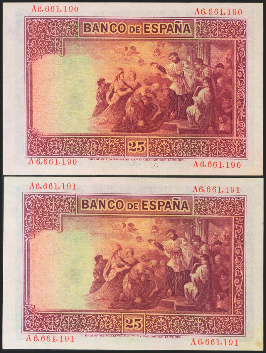 25 Pesetas. 12 de Octubre de 1926. Pareja correlativa. Serie A y sello en seco "GOBIERNO PROVISIONAL DE LA REPUBLICA-14 ABRIL 1931". (Edifil 2021: 335). Rarísima, apresto original. EBC+.