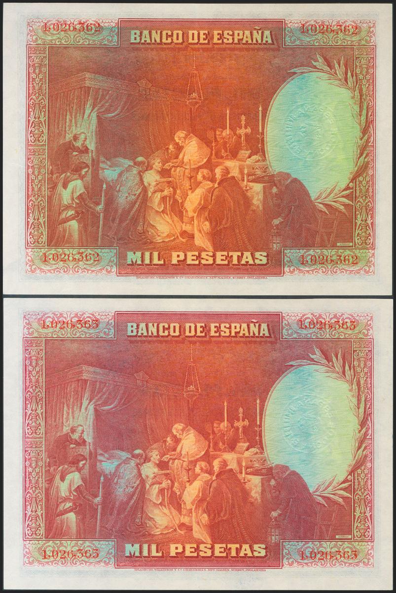 100 Pesetas. 15 de Agosto de 1928. Pareja correlativa. Sin serie y con sello en seco apócrifo "BANCO DE ESPAÑA-SEGURIDAD". (Edifil 2021: 357). Conserva gran parte de su apresto original. EBC+.