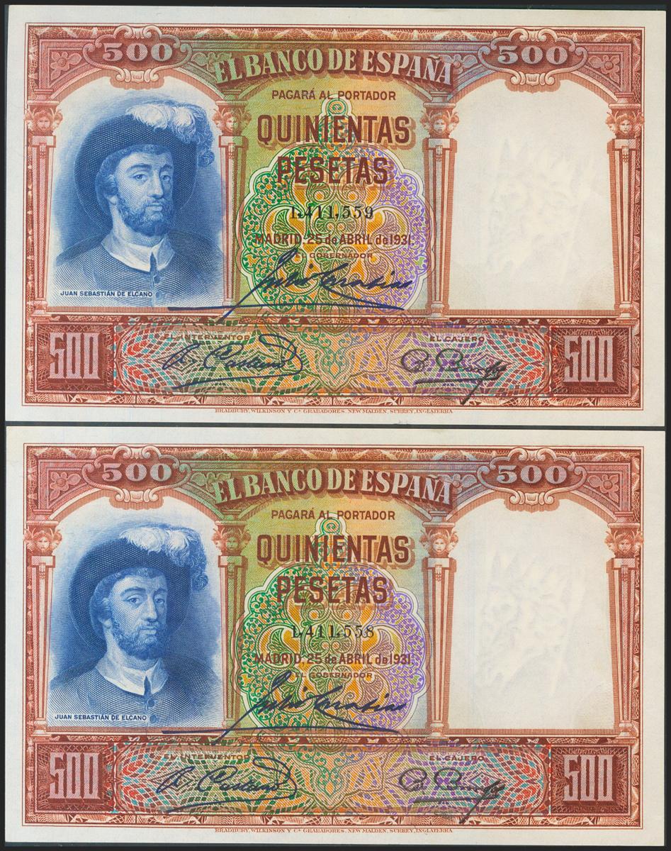 500 Pesetas. 25 de Abril de 1931. Pareja correlativa. Sin serie. (Edifil 2021: 361). Conserva todo su apresto original. SC-.