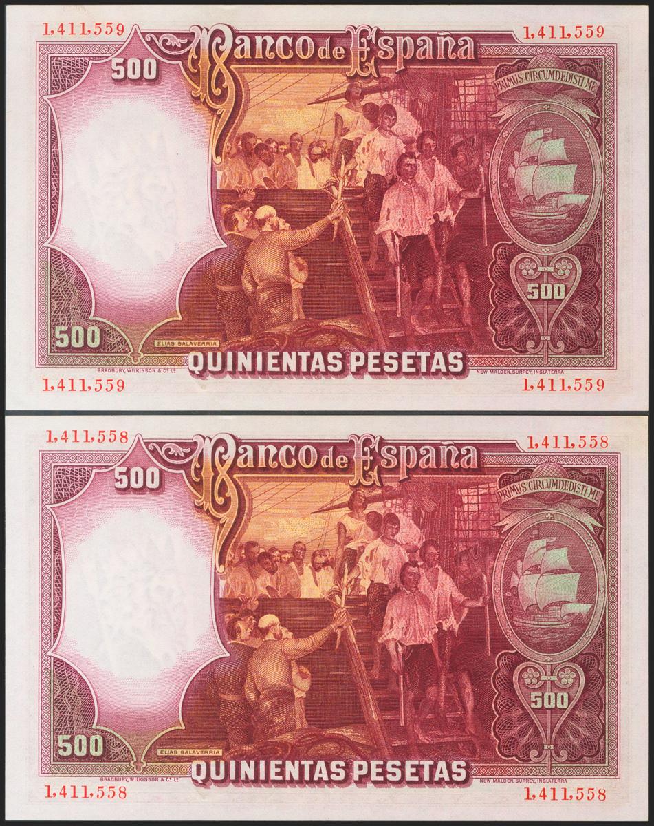 500 Pesetas. 25 de Abril de 1931. Pareja correlativa. Sin serie. (Edifil 2021: 361). Conserva todo su apresto original. SC-.