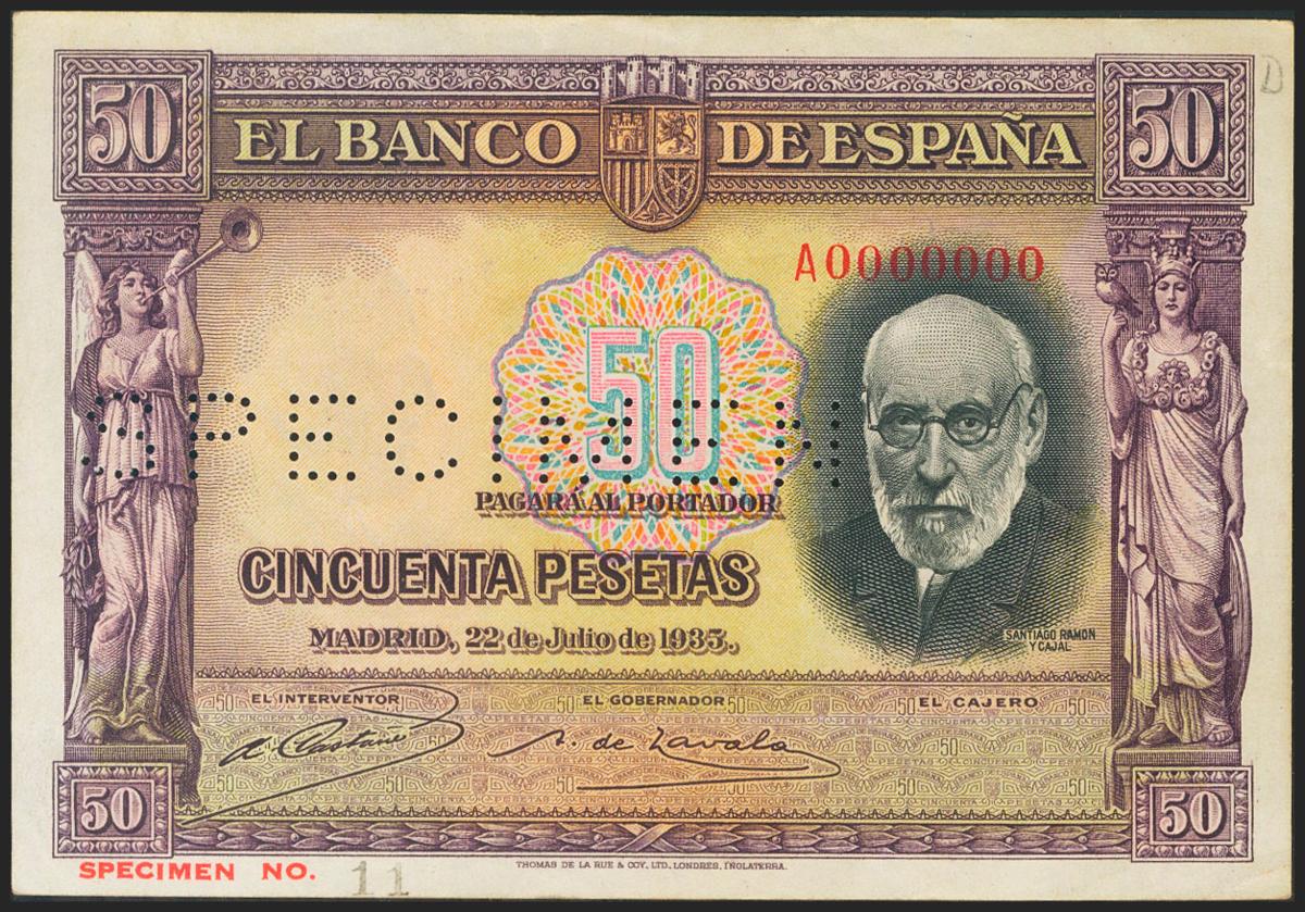 50 Pesetas. 22 de Julio de 1935. Serie A, numeración 0.000.000, taladro "SPECIMEN" y sin firma del cajero, con numeración 11, son muy raros los specimenes numerados, normalmente para autoridades de alto rango. (Edifil 2021: 366M). Muy raro, conserva todo su apresto original. EBC+.