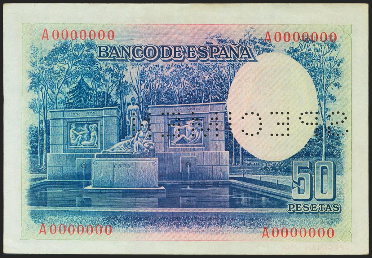 50 Pesetas. 22 de Julio de 1935. Serie A, numeración 0.000.000, taladro "SPECIMEN" y sin firma del cajero, con numeración 11, son muy raros los specimenes numerados, normalmente para autoridades de alto rango. (Edifil 2021: 366M). Muy raro, conserva todo su apresto original. EBC+.