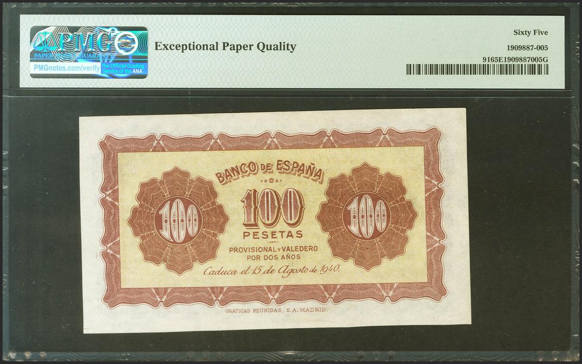 100 Pesetas. 15 de Agosto de 1938. Billete Provisional por 2 años no emitido del Banco de España, Barcelona. Sin serie. (Edifil 2017: NE37, Pick: 91). Estaba prevista la emisión de este billete con origen en la sucursal catalana de Barcelona, el cual se llegó a imprimir en los talleres de Gráficas Reunidas de Madrid, debido a los avatares de la Guerra Civil no llegó a ser emitido y fueron destruídos, sólo se conocen escasísimos ejemplares, el catálogo Edifil menciona tres combinaciones de color. Apresto original. SC. Encapsulado PMG65EPQ.