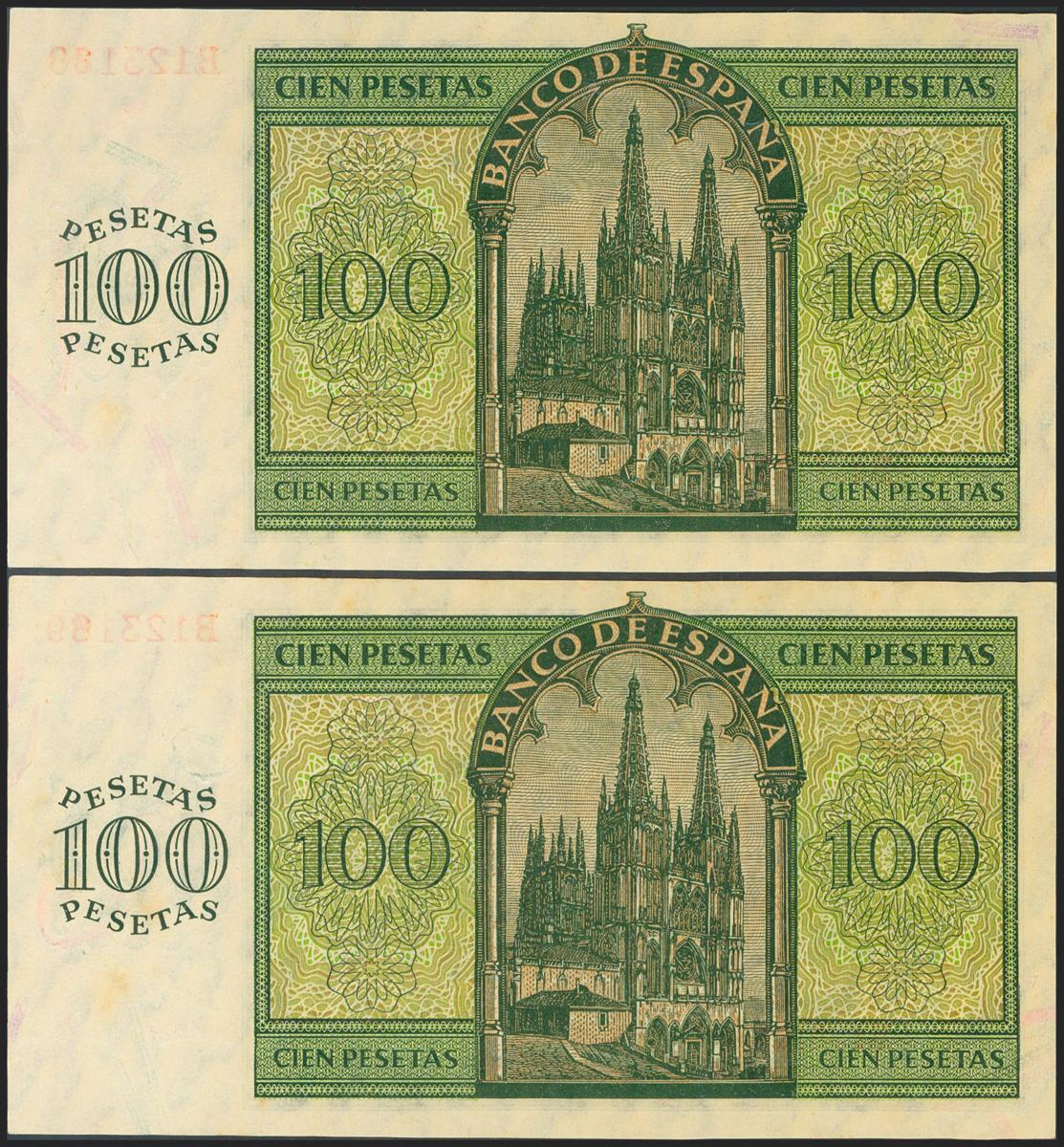100 Pesetas. 21 de Noviembre de 1936. Pareja correlativa. Serie B. (Edifil 2021: 421a). Conserva gran parte del apresto original. EBC+.