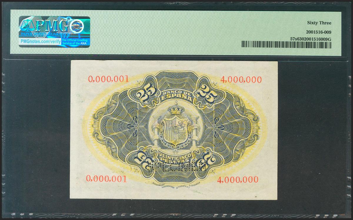 25 Pesetas. 24 de Septiembre de 1906. Nº0.000.000, taladrado SPECIMEN en el lugar de la firma del cajero y al dorso control de tirada desde el 0.000.001 al 4.000.000. (Edifil 2021: 314P, Pick: 57s). Raro, procedente del archivo Bradbury. SC. Encapsulado PMG63.