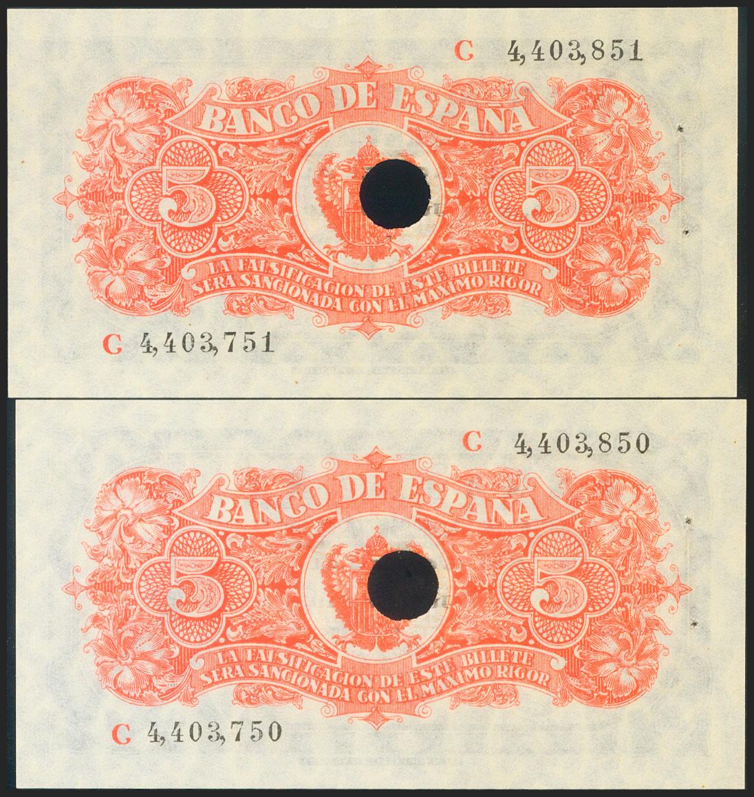 5 Pesetas. 18 de Junio de 1937. Pareja correlativa. Serie C, última serie emitida, error en la numeración al dorso que presenta un salto en el dígito de la centena en ambos billetes. Taladrados y con puntitos de grapa. (Edifil 2017: 424a). Apresto original y rarísima. SC-.