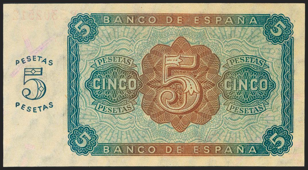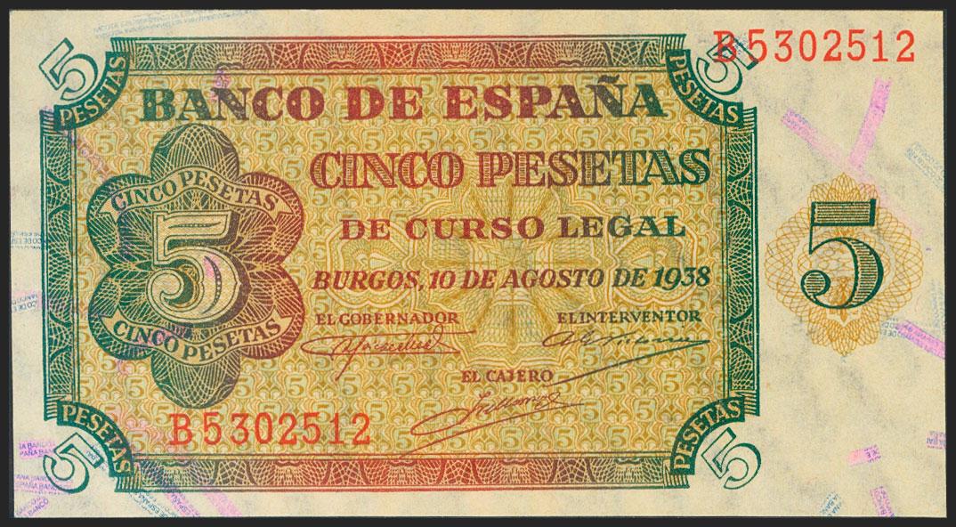 5 Pesetas. 10 de Agosto de 1938. Serie B. (Edifil 2021: 435a). Apresto original. SC.