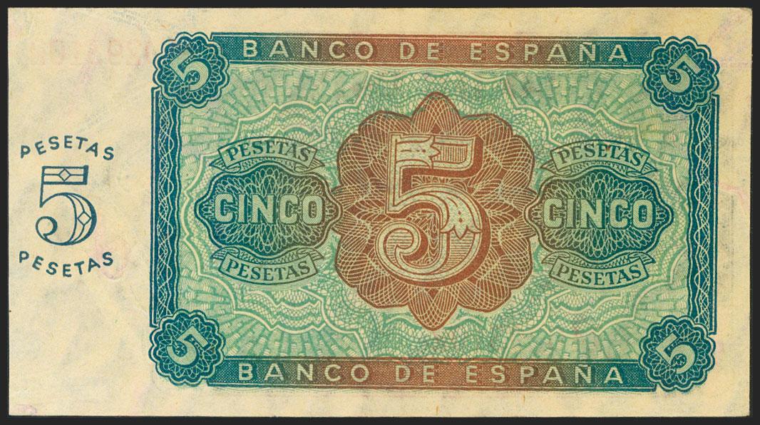 5 Pesetas. 10 de Agosto de 1938. Serie especial M, última serie emitida. (Edifil 2021: 435b). Rarísimo, conserva todo su apresto original. SC.