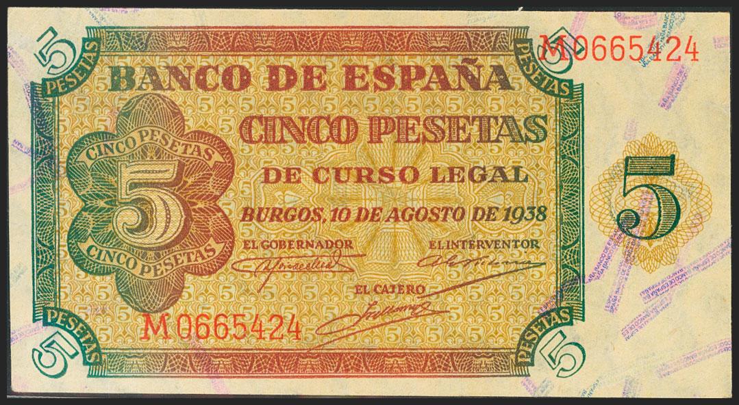 5 Pesetas. 10 de Agosto de 1938. Serie especial M, última serie emitida. (Edifil 2021: 435b). Rarísimo, conserva todo su apresto original. EBC+.