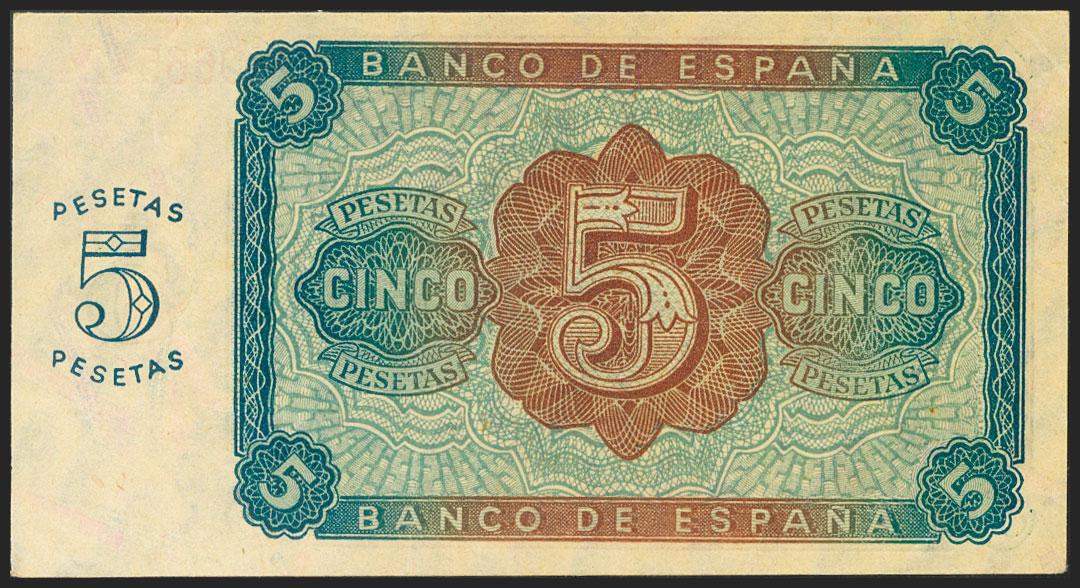 5 Pesetas. 10 de Agosto de 1938. Serie especial M, última serie emitida. (Edifil 2021: 435b). Rarísimo, conserva todo su apresto original. EBC+.