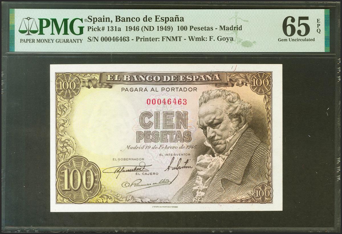 100 Pesetas. 19 de Febrero de 1946. Sin serie. (Edifil 2021: 451, Pick: 131a). Conserva todo el apresto original. SC. Encapsulado PMG65EPQ.