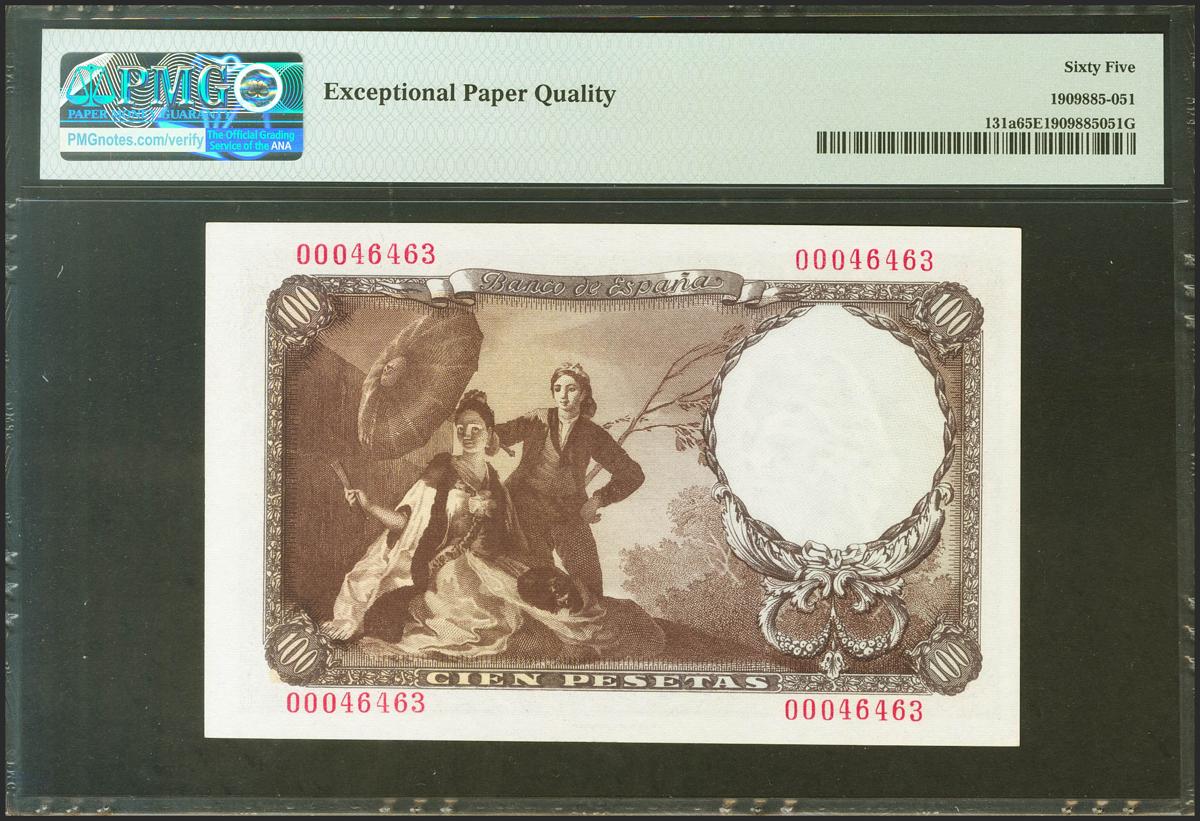 100 Pesetas. 19 de Febrero de 1946. Sin serie. (Edifil 2021: 451, Pick: 131a). Conserva todo el apresto original. SC. Encapsulado PMG65EPQ.