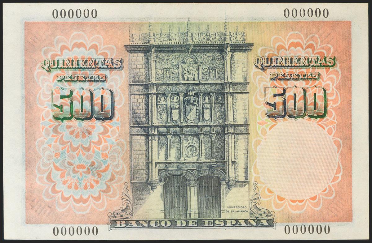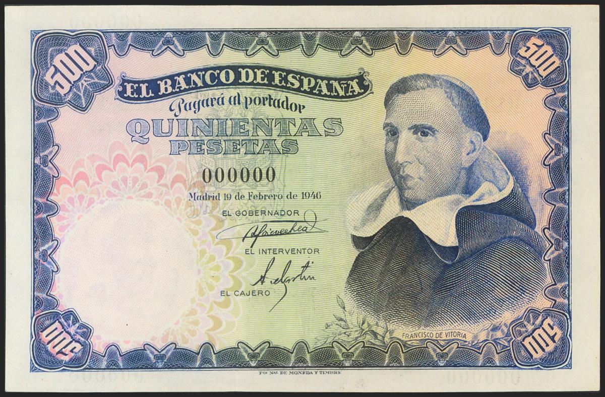 500 Pesetas. 19 de Febrero de 1946. Sin serie y con numeración 000000. (Edifil 2021: 452M). Rarísimo, apresto original. SC.