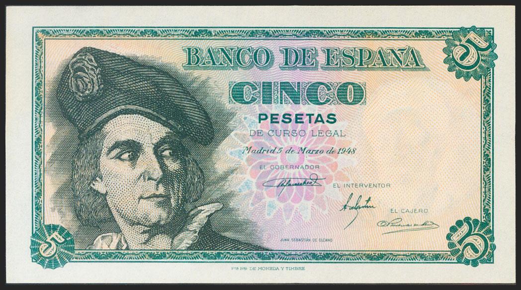 5 Pesetas. 5 de Marzo de 1948. Sin serie. (Edifil 2021: 455). Apresto original. SC.