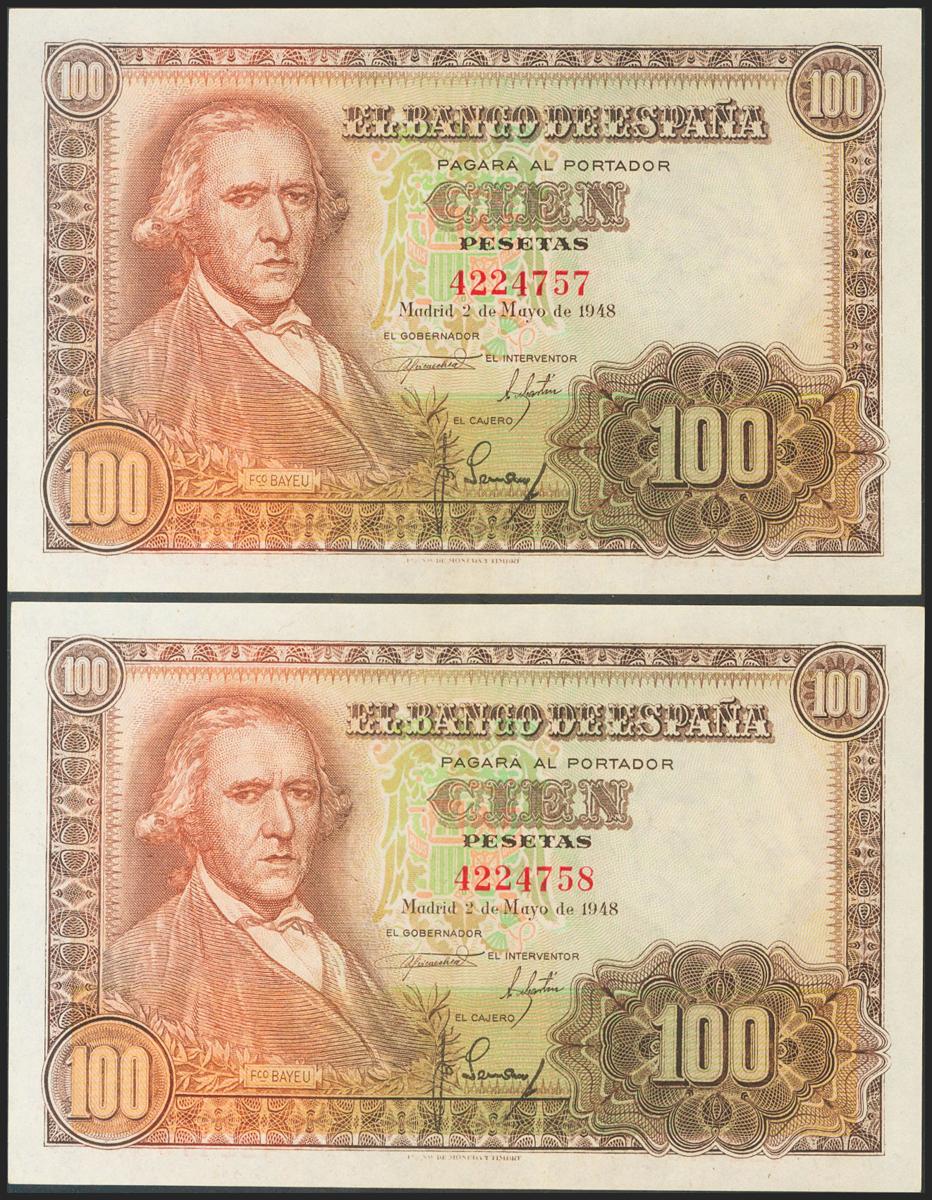 100 Pesetas. 2 de Mayo de 1948. Pareja correlativa. Sin serie. (Edifil 2021: 456). Conserva gran parte del apresto original. EBC++.