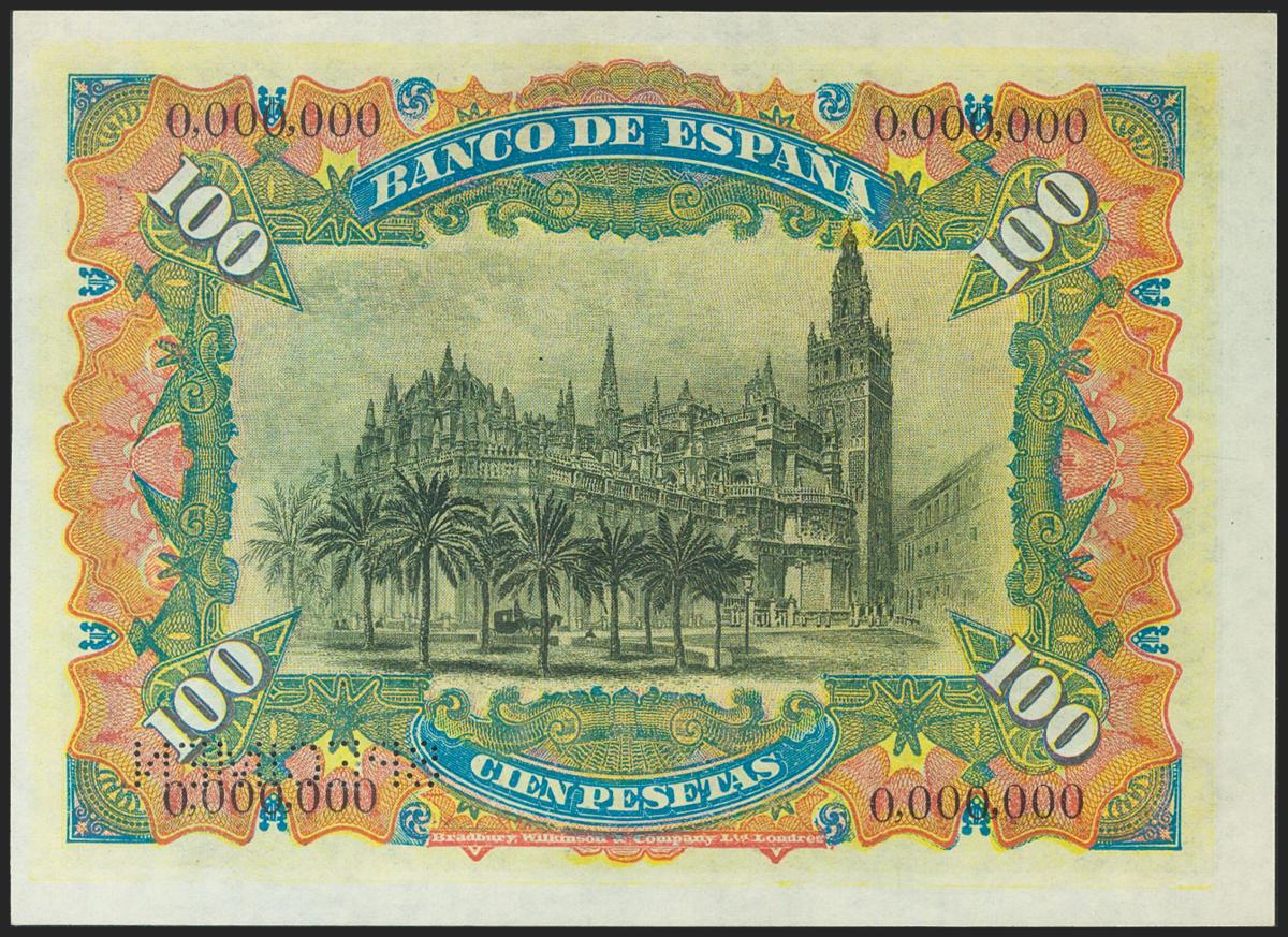 100 Pesetas. 15 de Julio de 1907. Sin serie y numeración 000000, taladrado SPECIMEN y sin fima del cajero. (Edifil 2021: 320M). Presenta todo su apresto original. SC.