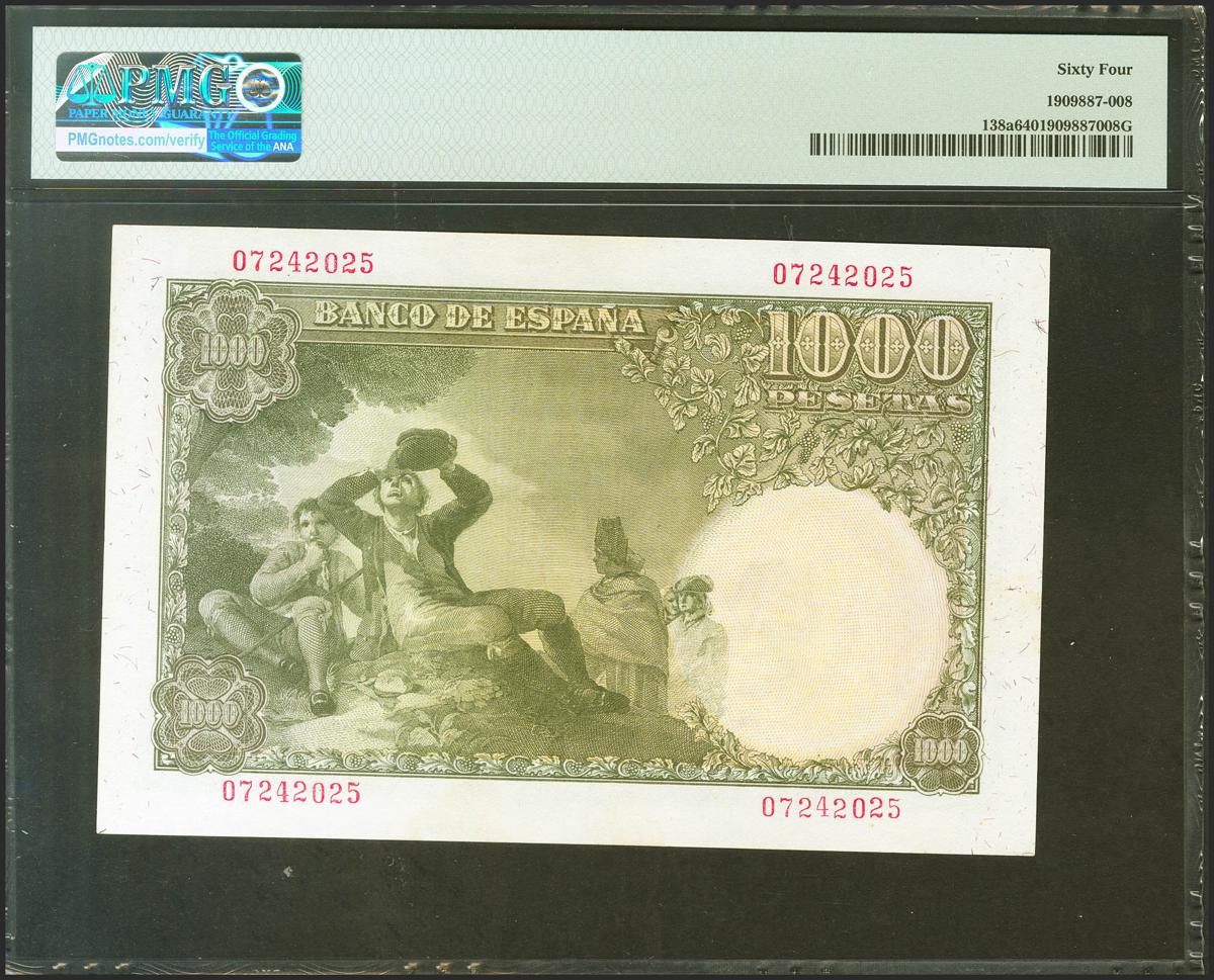 1000 Pesetas. 4 de Noviembre de 1949. Sin serie. (Edifil 2021: 458, Pick: 138a). Inusual en esta calidad. SC. Encapsulado PMG64.