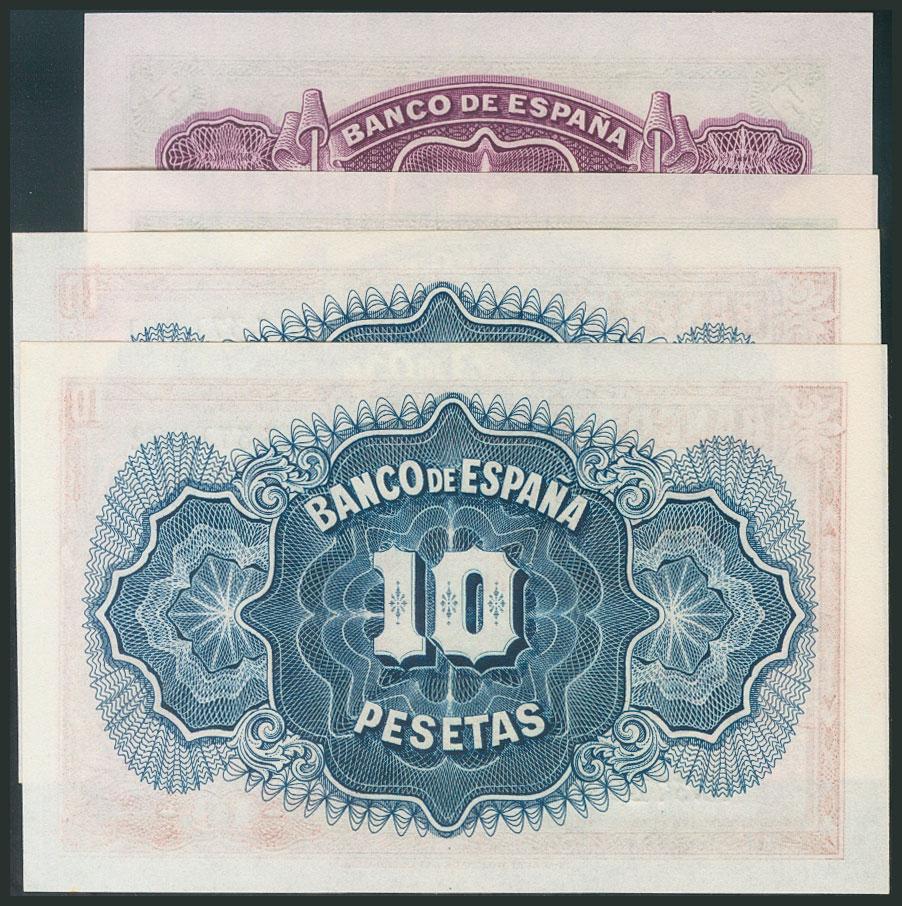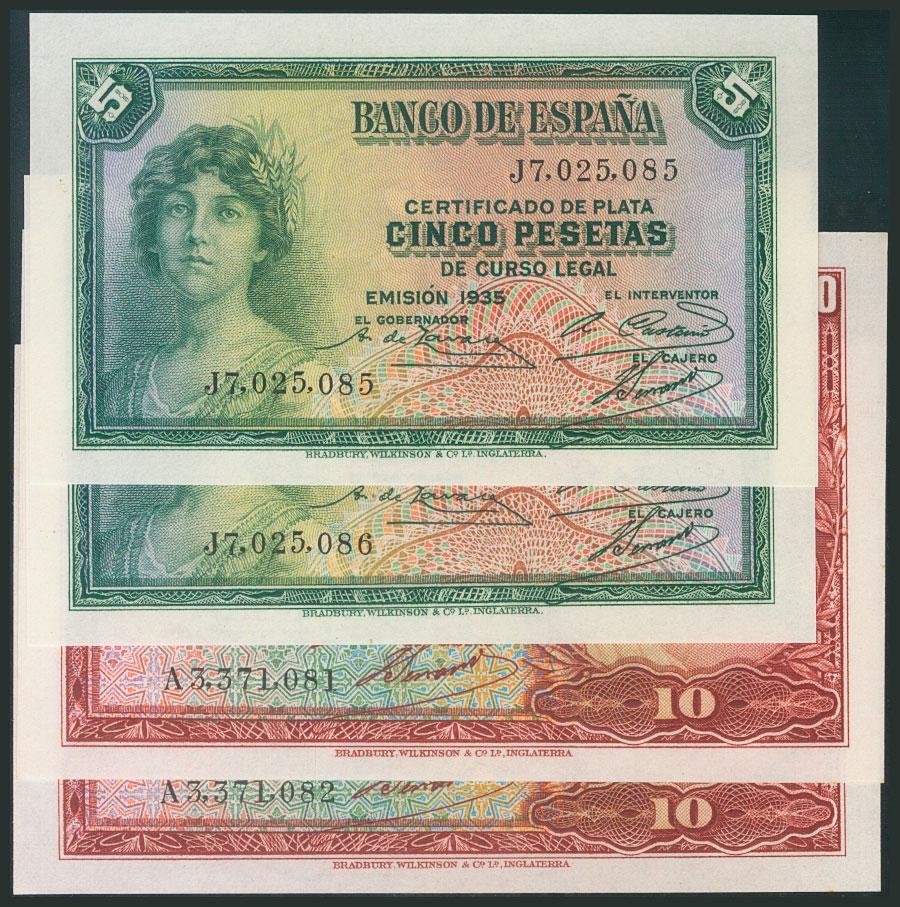 Conjunto de 2 parejas correlativas de 5 Pesetas y 10 Pesetas emitidas en 1935 y con las series J y A, respectivamente (Edifil 2017: 363b y 364a). Apresto original. SC.